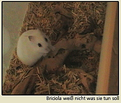 Briciola hamstert Video 3 Video 4 Briciola weiß nicht, was sie tun soll Video 5 Briciola entdeckt Steine und erschrickt (sehr empfehlenswert!) Video 6 Murkse öffnet den Schraubverschluss ihres Futterglases (der fest verschlossen war!) ![]() Für die Filme wird z.B. der Windows Media Player benötigt. Hier herunterladen |